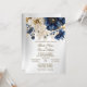 Bröllopsinbjudan i marinblå, vit och guld med blommig silverdekoration. Unik, vacker, modern design. Lätt att anpassa. Teckensnitt, storlek och färger kan ändras. Matchande artiklar tillgängliga.