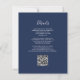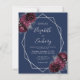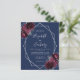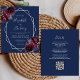 Denna eleganta moderna bröllopsinbjudan har en silvergeometrisk ram dekorerad med burgunderröda och silverfärgade blommor på en marinblå bakgrund. Den anpassningsbara texten kombinerar silvergrå, fantasifull handskrift, kopparplåt och kursiva teckensnitt. Lägg till ytterligare detaljer på baksidan, tillsammans med en QR-kod för att hjälpa dina gäster att besöka din bröllopswebbplats.
