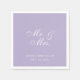 Bröllopsservetter för ett bröllop med lavendelfärgad brölloppsfärg. Bara vit text på lavendel lila bakgrund. Orden "Mr. & Mrs." är skrivna med en elegant kalligrafisk skrift, namnen på bruden och brudgummen och datumet i mindre versaler.