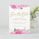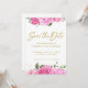 Modern akvarell rosa rosor med gyllene handskrivna typsnitt anpassningsbar "Spara datum" inbjudan. Denna design har vackra rosa rosor och ett stort kalligrafiskt typsnitt som du kan ändra från guld till valfri färg. Du kan också anpassa alla detaljer och textfärger i denna Spara datum-design.