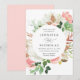 Eleganta blommiga bröllopsinbjudningar med dina bröllopsdetaljer omgivna av en blommig ram av rosafärgade akvarellrosor och tulpaner med frodiga gröna och kopparfärgade blad. De blommiga bröllopsinbjudningarna har en ljus rosafärgad bakgrund på baksidan. Designad för att samordna med vår samling för rosafärgat vårblommigt bröllop.