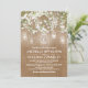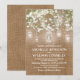 För den perfekta rusticerade landsbröllopsinbjudan behöver du inte leta längre än dessa gnistrande ljusdesigner. Med en unik rusticerad brun burlap-effektbakgrund, eleganta murarljus med snurra och ett vackert fält med babysandblommor kommer dessa inbjudningar att sätta tonen för ett verkligt oförglömligt bröllop. För att göra din händelse ännu mer speciell är texten tryckt i en skarp vit typsnitt som binder samman hela looken.