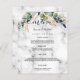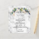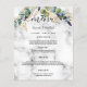 En elegant, modern meny och bröllop-meny. En marmorbakgrund som dekoreras med eukalyptus grey och gyllene löv anpassar och lägger till namn, datum och bröllop-menyn. Svart färgad brev. Menyn ord är skriven med ett trendig-handskript i stil med dekortecken. Baksida: vit bakgrund och glitter droppar i guldfaux. Matchande kort och platskort från bord finns i vår butik.