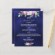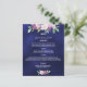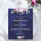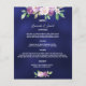 En marin blå bakgrund, blå färg är ojämn. Dekorerad med rosa, violett, lila vattenfärgade blommor. Mallar för namn och bröllop-menyn. Baksida: marin blå bakgrund.