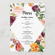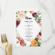 Fall bröllopsmeny med vackra blommor och utbytbar text, tryckt på vit bakgrund.