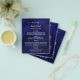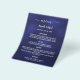 Observera att inbjudan är papper och mycket tunn. Kuvert ingår inte. Om du vill ha mer omfattande inbjudningar (samma design) kan du besöka vår butik. En klassisk bröllop-meny. En blå bakgrund. Den blå färg är ojämn. Vit text. Anpassa och lägg till ditt namn, datum och menyn. Du kan lägga till mer text, foton på baksidan.