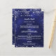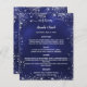 En klassisk bröllop-meny. En marin blå bakgrund, dekorerad med faux silver glitter-gnistor. Den blå färg är ojämn. Vit text. Anpassa och lägg till ditt namn, datum och menyn. Du kan lägga till mer text, foton på baksidan. 1 lakan = 1 meny utskriven kant till kant.
