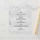 Ett elegant, glamoröst bröllop-menykort. Anpassa och lägg till namn, datum och bröllop-menyn. Faux silver metallisk tittar bakgrund, dekorerad med faux glitter stoft. Tillbaka: Stoft från silver och glitter, foto och lägg till berättelsen från kärlek. Ge-folket har något att tala om medan man väntar på att maten ska serveras!