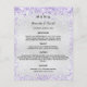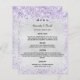 Ett elegant, glamoröst bröllop-menykort. Anpassa och lägg till namn, datum och bröllop-menyn. Faux silver tittar bakgrund, dekorerad med lila, lavender konetti.
