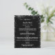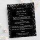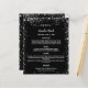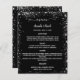 En elegant, glamorös bröllop-meny. En svart bakgrund, dekorerad med faux silver glitter, gnistor. Vit text. Anpassa och lägg till ditt namn, data och menyn. Du kan lägga till mer text, foton på baksidan. 1 lakan = 1 meny utskriven kant till kant.