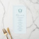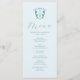 Den här elegant bröllop-menyn har en enkel monogramsformad vapensköld med briden och trimmans initialer. Ord "Meny" är inställd i calligraphy-skript. Använda mallen fält om du vill lägga till menyalternativ på anpassningsbarna i turkos över en blek blå bakgrund. Perfekt till bröllop, repetitionsmiddag, förlovningsfester och mycket annat.
