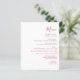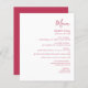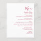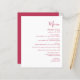 Den här enkla moderna bröllop-menyn har magenta på vit bakgrund. Ord "Meny" visas i snyggtens handskriftsgrafi. Lägg till parets datum namn och bröllop i skript och kursiv stil, tillsammans med menydetaljer i sans serif-teckensnitt. Den omvända sidan är en matchande skuggning av solid magenta.