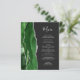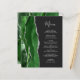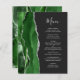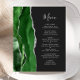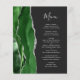 Den moderna bröllop-menyn på den lämnat kant i eleganten har en vattenfärgad grönt i jägare i gräns som trimmas med faux silver glitter. Anpassadet kombinerar handskrift och mönstertext typsnitt i silver grått på en svartvit bakgrund. Den omvända sidan har en matchande grönt och silver agate-design.