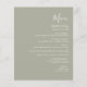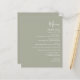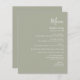Den här enkla moderna bröllop-menyn har vit grönt på sidans bakgrund. Ord "Meny" visas i snyggtens handskriftsgrafi. Lägg till parets datum namn och bröllop i skript och kursiv stil, tillsammans med menydetaljer i sans serif-teckensnitt. Baksidan är en matchande skuggning av solid sage-grönt.