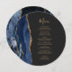 Den moderna bröllop-menyn på den lämnat kant i eleganten har en marin blå vattenfärg som ruttnar gräns med faux guld glitter. Anpassadet kombinerar guld-färgad-handskriftsskript och typsnitt på en skiffersvart bakgrund. Den omvända sidan har en matchande marin blå och guld-agate-design.