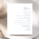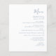 Den här enkla moderna bröllop-menyn har dammig blå text på vit bakgrund. Ord "Meny" visas i snyggtens handskriftsgrafi. Lägg till parets datum namn och bröllop i skript och kursiv stil, tillsammans med menydetaljer i sans serif-teckensnitt. Den omvända sidan är en passande skugga av fast dammblått.