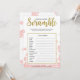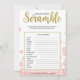Denna moderna blommiga "Bridal Word Scramble" har en rosa blommig bakgrund med gyllene glitterstänk. Texten är skriven i en kombination av ett lekfullt kalligrafiskt teckensnitt och ett modernt sans-serif-teckensnitt, detta Bridal Word Scramble-kort är personligt med brudens namn och datum för brudens shower.