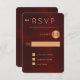 Svarskort för lyxolja bröllop med elegant med två små metalliska hjärtan för koppar i ro och en cirkel med det begärda svarsdatumet inuti på en djup röd maronantik, plågad tittar sammet som bakgrund. +++++++++++++++ Kortet är lämpligt för trendig av modernt inomhusbruk för alla säsonger i klass bröllop. Rekommenderas mest för vintersemestrar under julhelgen.