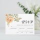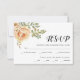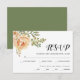 Blomsterbukett av blommor skriver typografiskt bröllop OSA med val av måltid. Den visar en vacker bukett av cactus blommor och löv i persikor och korall och din text. Ord OSA är i manustypografi. Baksidan är av solid grönt färg.