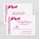 Ett svarskort för landsbyggsbröllop med OSA som innehåller en häst- och vagndesign med elegant vintage blommor och viner som blommar upp längs i shock rosa fuchsia magenta färg på vit bakgrund. Dessa är designade för att matcha dessa inbjudningar till häst och bugggiga bröllop i land: