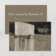 Anpassa det avslappnade och informella OSA-svarskortet för landsbygdsstängsel efter Landsbyggsbröllop med ditt specifika giftermål-svarsdatum. En digital gammal papper effekt och sepiaton har lagts till för att förbättra vintagens utseende. Det här rustiska anpassningsbarna ranch nuptial r.s.v.p.-kortet har ett foto av en sepia-tonservergrupp av ett trästängselinlägg och taggtråd.