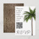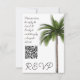 Handflatan träd, bröllop QR-kodsvarskort med tropiskt tema. En hög handflatan träd står över den vita bakgrunden på små kort för lodrät. Skapa din egen kod för att lägga till i mallen och göra det enkelt för gästerna att svara på bröllop, duschar eller andra stora evenemang. En kort-punkt kan läggas till på den lämnat sidan där gästerna uppmanas att svara vid ett visst datum. Kortets baksida har en bild av handflatan träd bark.