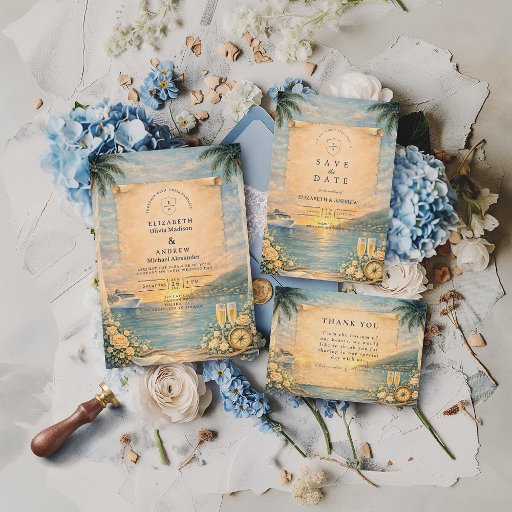 Fira din kärlekshistoria med en tidlös, kryssningsinspirerad bröllopsdesign, perfekt för par som vigs till sjöss eller drömmer om en elegant nautisk miljö. De mjuka solnedgångsfärgerna och den klassiska layouten skapar en romantisk atmosfär som är idealisk för formella, destination- eller havstematiska ceremonier. Helt anpassningsbar med era namn, datum och evenemangsinformation, är denna design lämplig för kryssningsbröllop, strandnära lokaler eller eleganta destinationfestligheter.