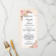 En elegant bohemisk boho stil bröllopsmeny kort. Personifiera och lägg till era namn, datum och firande meny. Valvbåge och gyllene marmortryck som bakgrund. Dekorerad med rosafärgade blommor och pampas gräs.