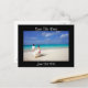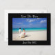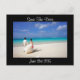 Beach themed bröllop spara datum kort. Beach themed bröllop. Ett vackert par i deras bröllop-attityd, sett bakifrån. Att gå hand i hand på en underbar strand i sol som dränkte tropiska stranden. Vit sand, kristallklar blå turkos vatten, ett molnlöst himmel och en ljusstark solnydag bidrar till att skapa en perfekt och minnesvärd bröllopsdag. Anpassa baksidan med dina egna uppgifter om bröllop.