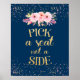 Bröllop Poster Plocka ett säte som inte är ett Side Navy Navy Guld Ram som poster i ett ram för att välkomna gästerna vid bröllop och styra dem som de ska sitta där. Den här designern poster med en marin blå bakgrund, med rosa och guld konetti och vackra vattenfärgsblommor bouquet.