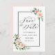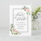 Denna bröllops inbjudan att spara datumet har målade akvarellblommor i rosa, vit och grön bladverk med en rektangulär ram. För mer avancerad anpassning av denna design, vänligen klicka på "Anpassa"-knappen. Matchande artiklar finns också tillgängliga.