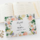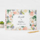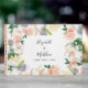 En romantisk gäst bok för vår eller sommar bröllop. På framsidan: Dekorerad med lush vattenfärgade blommor, blommigtar - ro och peonier i vitt, kräm, korall och persikor. Mallar för namn och bröllop-datum. Er namn är skriven med ett modernt handskript i stil, svart brev. Rygg: Lägg till egen text. Svart text Bakåt: färgadens bakgrund.