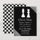 Svart och vit bröllops kallelse sparad underrättelse i schack tema. Silhuetter av en vit drottning och kung schackpjäs pryder toppen av den svarta underrättelsen, med övre högra och nedre vänstra hörnen utförda i ett svart och vitt rutmönster. Text i vitt är redo att anpassas med din bröllopsinformation. Bra underrättelse för det schackälskande paret.