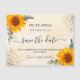 En trendig bröllop spara datum magnet. En guldfärgad bakgrund som dekorerats med solblommor, eukalyptus foliage, guldblad och faux-damm från guld glitter. Anpassa och lägg till datum, namn och text. Texten: Spara datumet skrivs med ett stort trendig-handskript i stil med dekortecken.
