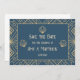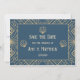 Art Deco bröllop spara datum-kort med marin blå bakgrund och guld-geometriska motiv