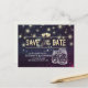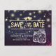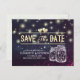 Bröllop spara datum vykortsmallar - Elegant Faux guldfil Spara datumskript och Vintage Mason Burk String Ljus på Lila Gnistra Bokeh Ljus Background. En Perfekt för din stora dag. Alla textstorlekar i stil, färg, kan ändras för att passa dina behov!