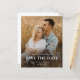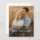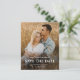 Ett enkelt Namn Photo Bröllop spara datum-kort med fullt utfallsfoto och övertäckningstypografi på framsidan. Baksidan har en andra bild och ytterligare information. Klicka på knappen Redigera om du vill anpassa designen.