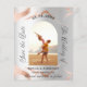 En modern och elegant Spara datum för ett bröllop. En faux silver-tittar bakgrund, dekorerad med marmor från ro guld. Anpassa och lägg till datum, foto och namn. 1 lakan = 1 inbjudan tryckt kant till kant.