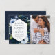Blåblå vattenfärgshand i marinen målade blommor med skript och ett foto av paret. Färg och textdetaljer kan vara personlig.