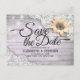 Spara Datum Bröllopsinbjudan Postkortmallar - Vintage spets, solros och strängljus på rustik trähybrid. Ett perfekt design för din stora dag! Alla textstilar, färger, storlekar kan ändras för att passa dina behov.