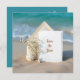 Ett tomt bröllopsinbjudningskort sätts elegant mot en strandbakgrund, tillsammans med känsliga vita zigenarblommor, en stjärnfisk och en sanddollar. All text kan redigeras.