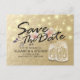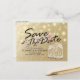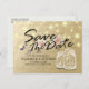 Bröllop Spara Datum Postkortmallar - Elegant Blommig Spara Datum Bokstäver Skrift och Vintage Murbruk Kruka Strängljus på Falsk Guld Folie Bakgrund.