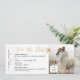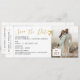 Spara datumpåstigningspasset för ett målbröllop eller Party för resetemedel innehåller ett stort par foto- och skripttexter bredvid typsnitt för vintagens datorutskrift för ett autentiskt klassiskt utseende och en helt redigerbar biljett-mall så att du kan skapa en unik elegant och guld spara datumet för ditt kreativ utomlands.