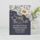 Spara Datum Bröllopsinbjudan Kortmallar - Eleganta Solrosor, Vintage Spetsram och Chic Strängljus på Marinblå Bakgrund.