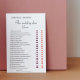 Svart- och vitt-kort Shoe Game för en Shower för Bröllop eller Par, anpassat med namn för bruden och brudgummen.Alla frågor i roligtens burguny möhippa-spel, bachelorette-spel och bröllop-skon kan ändras.