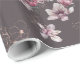 Vacker presentförpackning på en stoftig burgunderbakgrund med rosa blommor och färgglada fåglar.