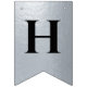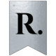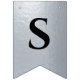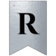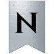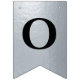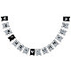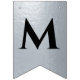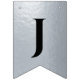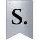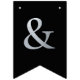 En flagg-girlang för en bröllopsfest med svarta och silverbröllopsfärger, med orden "Herr & Fru" och den nya familjens efternamn och 3 hjärtan. Texten är i svarta versaler på falskt silverfolie-bakgrund, hjärtana och et-tecknet är falskt silverfolie på svart bakgrund.