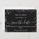 En modern och elegant Spara datum för ett bröllop. En svart bakgrund dekorerad med faux silver glitter. sparkles. Anpassa och lägg till ett datum och namn. Texten: Spara datumet skrivs med ett stort trendig-handskript i stil.