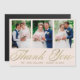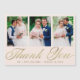 Skicka ett anpassningsbar-fototack till din familj och dina vänner för att tacka dem för att de närvarade vid bröllop. Den här elegantens designmall innehåller tre av dina bröllop-foton som ramats in . Under kalligrafiskriptet i mörk guld står det "Tack" med ditt namn och datum för att du ska kunna anpassa dig. Det var en glädje att skapa för dig. Gratulerar på giftermål! Designad av konstnären ©Susan Coffey.