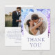 Bröllop Tack Foto Vattenfärg Wisteria Blommor Kort med ditt favoritfoto och texten "Tack" i modern lila skrifttyp accentuerad med vattenfärg blå, lila och lavendel wisteria blommor. På baksidan kan du lägga till ett extra foto med ditt personliga meddelande. En del av en samling designad av Evco Studio www.zazzle.com/store/evcostudio